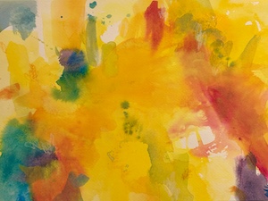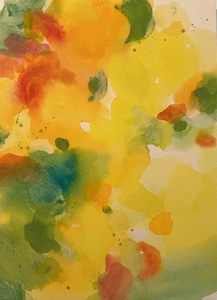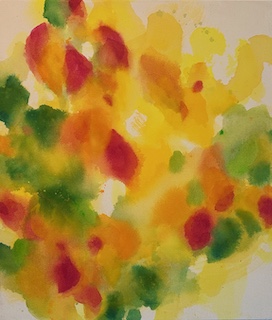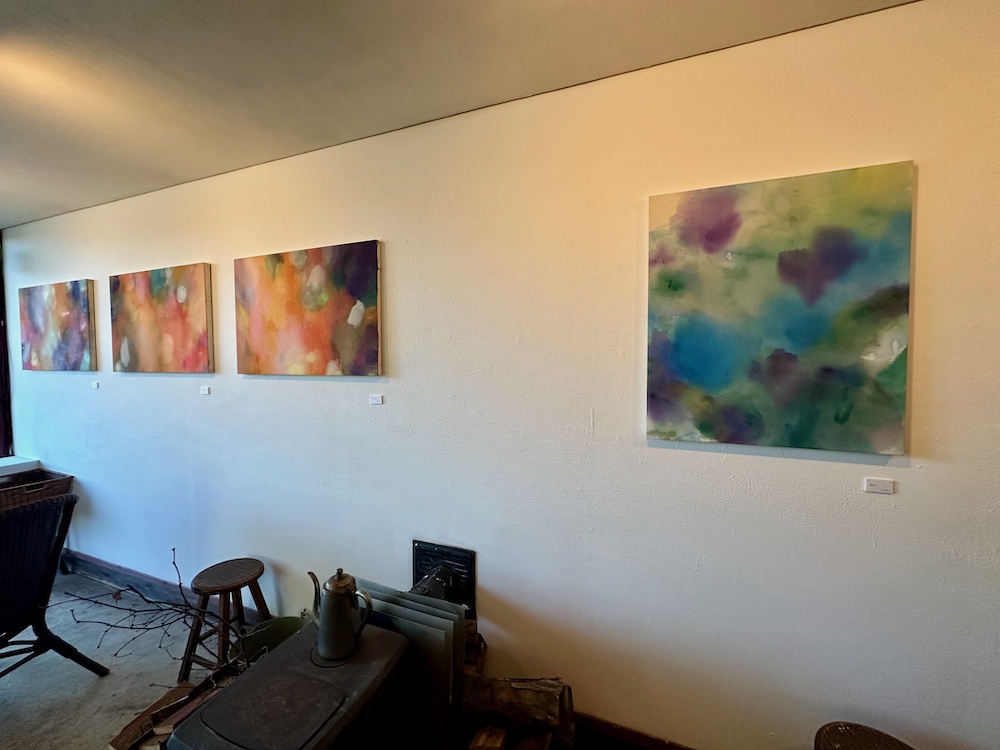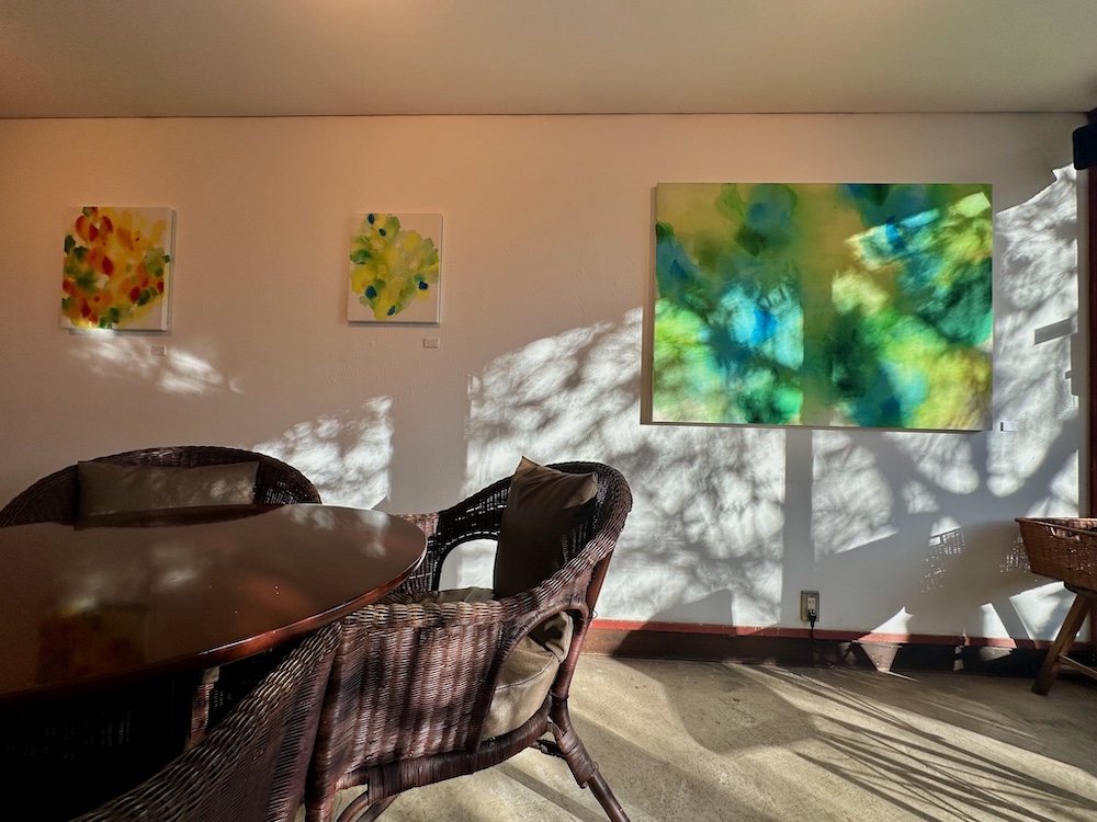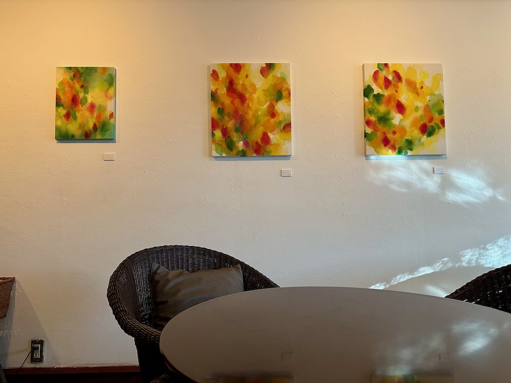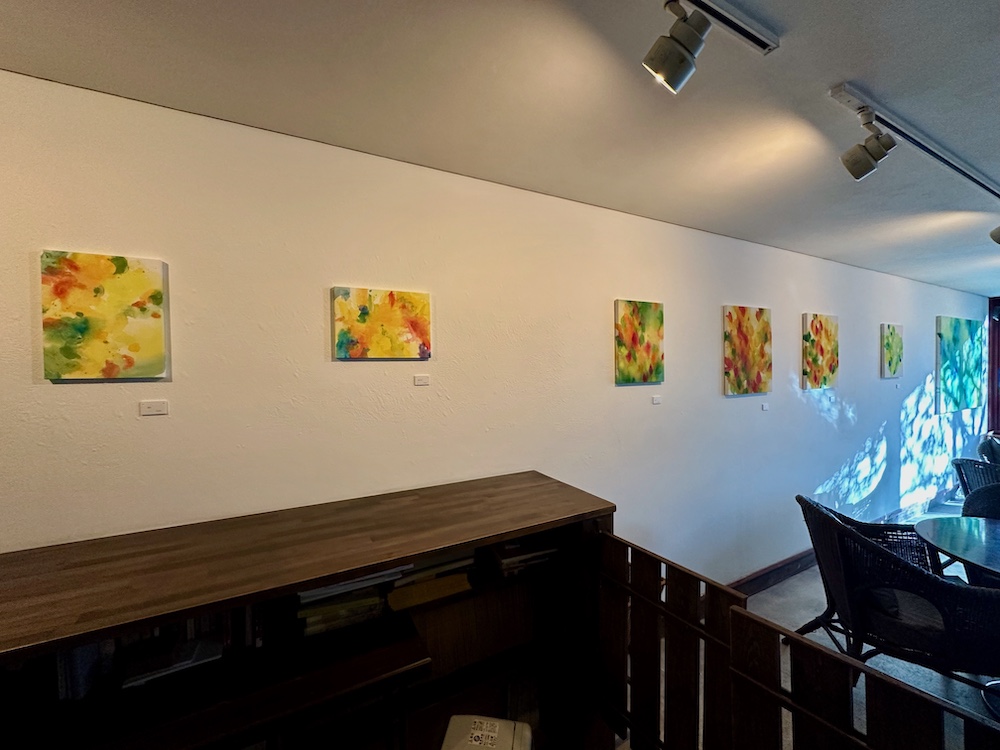 先日会場で小耳に挟んだところによると、こちらの壁の黄色い作品は作家の家の窓から見える木の葉がモチーフになっているようです。