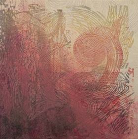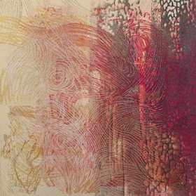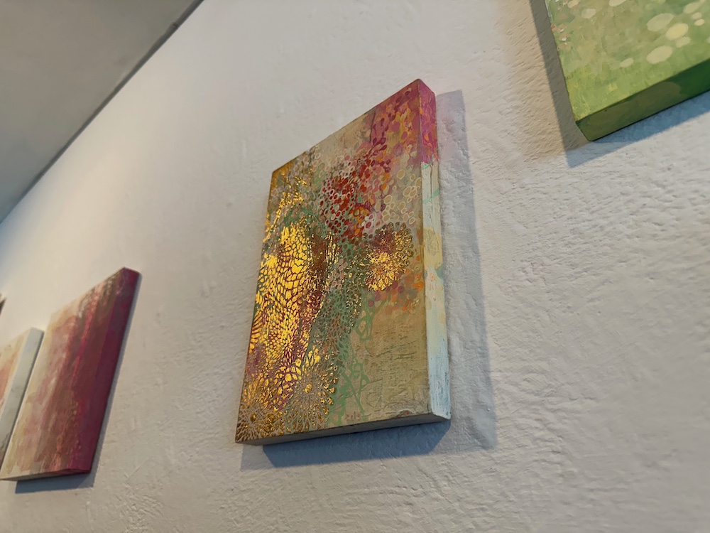 パネルを彫刻刀で掘ったり、アクリル絵具による着彩や、やすりを掛けたような研磨によって現れたフラットな色の断面など、複雑な表情と美しさがあります。