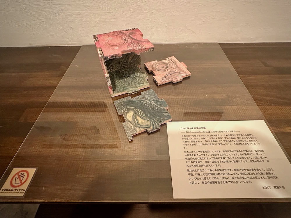 実際に版として刷られた板木を刻み箱にするという行為のなかで、この合板が現代の住宅建築に広く使われていることから箱という形状と空間が家に類似しているという認識を持ちます。しかしこの箱は手を使ってバラせば単体となり平面にすることもできるし、表も裏もなく変容する物として実在します。